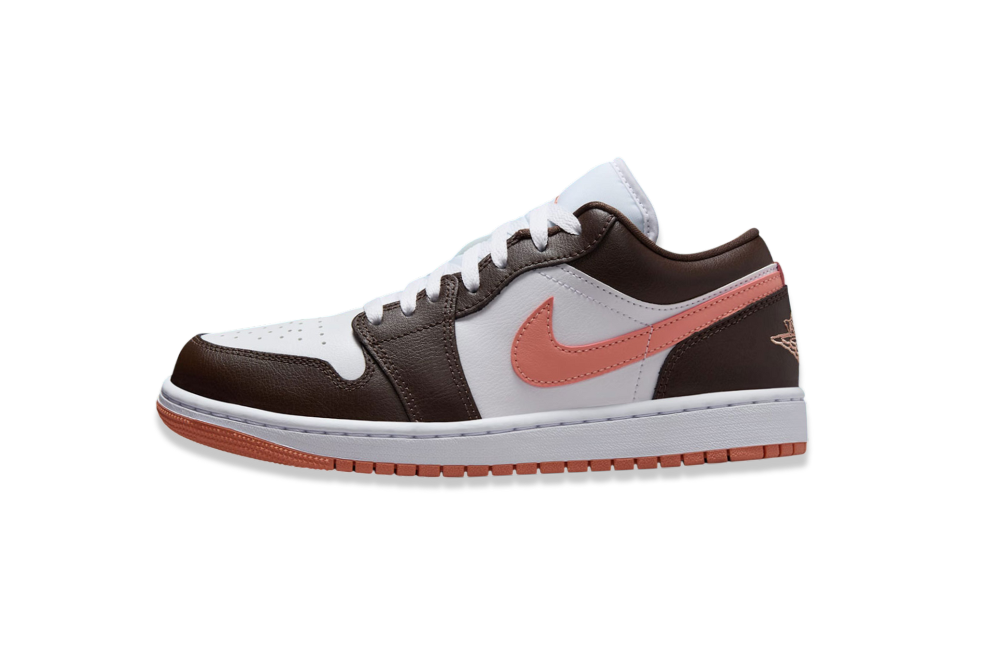 Nike Air Jordan 1 Low Brown and Pink fehér színű felsőrésszel, krém színű Durabuck rátétekkel és rózsaszín Swoosh-okkal. Megszokott Air Jordan Wings logó a sarokborításon kiegészíti az utolsó simítást, 1985 óta.